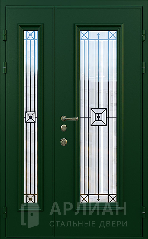 Фото «Двустворчатая входная дверь в частный дом со стеклом и решеткой №18»